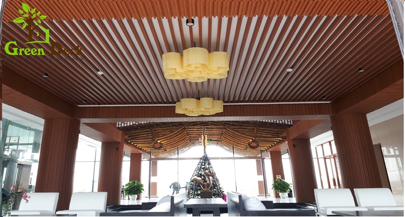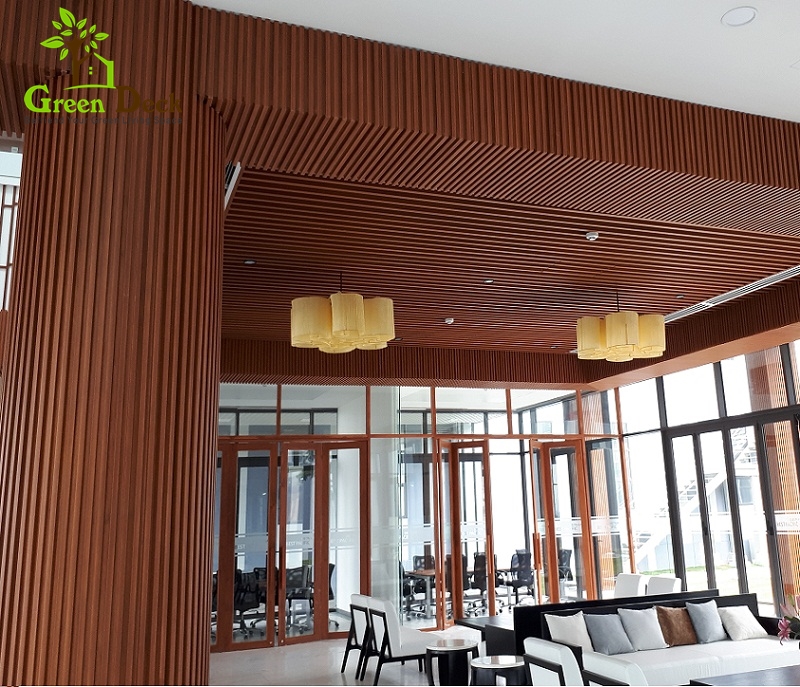 1. Trần giả gỗ composite - vật liệu thay thế gỗ tự nhiên, siêu nhẹ, dễ thi công, hoàn thiện đẹp mắt và đặc biệt rất giống gỗ tự nhiên