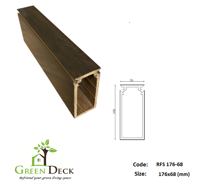 Thanh Lam Gỗ Giàn Hoa/ Mái Kính RSF176 được sản xuất trên dây truyền hiện đại nhập khẩu từ Đức đạt chuẩn Châu Âu, nguyên liệu sản xuất từ nhựa PVC nguyên sinh, bột gỗ, vỏ trấu và các phụ gia kết dính an toàn cho người sử dụng. Sử dụng công nghệ và công thức pha trộn đặc biệt có tỉ lệ thành phần từ gỗ cao nên các sản phẩm của Greendeck có tuổi thọ cao hơn, trọng lượng nhẹ hơn, thơm mùi của gỗ, và đặc biệt dễ thi công hơn rất nhiều so với các sản phẩm cùng loại khác. Ngoài ra, Thanh lam gỗ mái kính/ giàn hoa Greendeck còn được phủ lớp sơn đặc biệt bảo vệ bề mặt, làm tăng khả năng chịu được thời tiết thay đổi khắc nghiệt ngoài trời