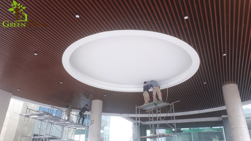 Với đội ngũ kỹ thuật cao và công nhân có bề dày kinh nghiệm trong việc thiết kế, cung cấp và thi công vật liệu trần gỗ Composite. Chúng tôi đã đáp ứng tốt yêu cầu khắt khe về thiết kế, chất lượng thi cũng như tiết độ hoàn thành phần Trần nan gỗ trên mặt trần sảnh cao gần 10m. Đặc biệt hơn nữa, thời gian chúng tôi thi công thì Tòa nhà vẫn hoạt động bình thường, sảnh tòa nhà là nơi có lưu lượng người ra vào đông đúc nhất, buộc chúng tôi phải thi công vào ban đêm. Với bài toán đặt ra làm thế nào để thi công ban đêm nhưng ban ngày toàn bộ sảnh phải được thu dọn giàn giáo, vật liệu và mọi hoạt động của Tòa nhà diễn ra bình thường. Với kỹ thuật lắp giáo thông thường thì thời gian lắp và tháo 5 tầng cũng mất vài tiếng đồng hồ chứ nói gì đến thi công với tiến độ nhanh, bằng kỹ thuật lắp đặt giáo treo đội ngũ kỹ thuật đã thực hiện đảm bảo an toàn lao động, thu dọn và dịch chuyển dễ dàng mà không tốn nhiều nhân công.